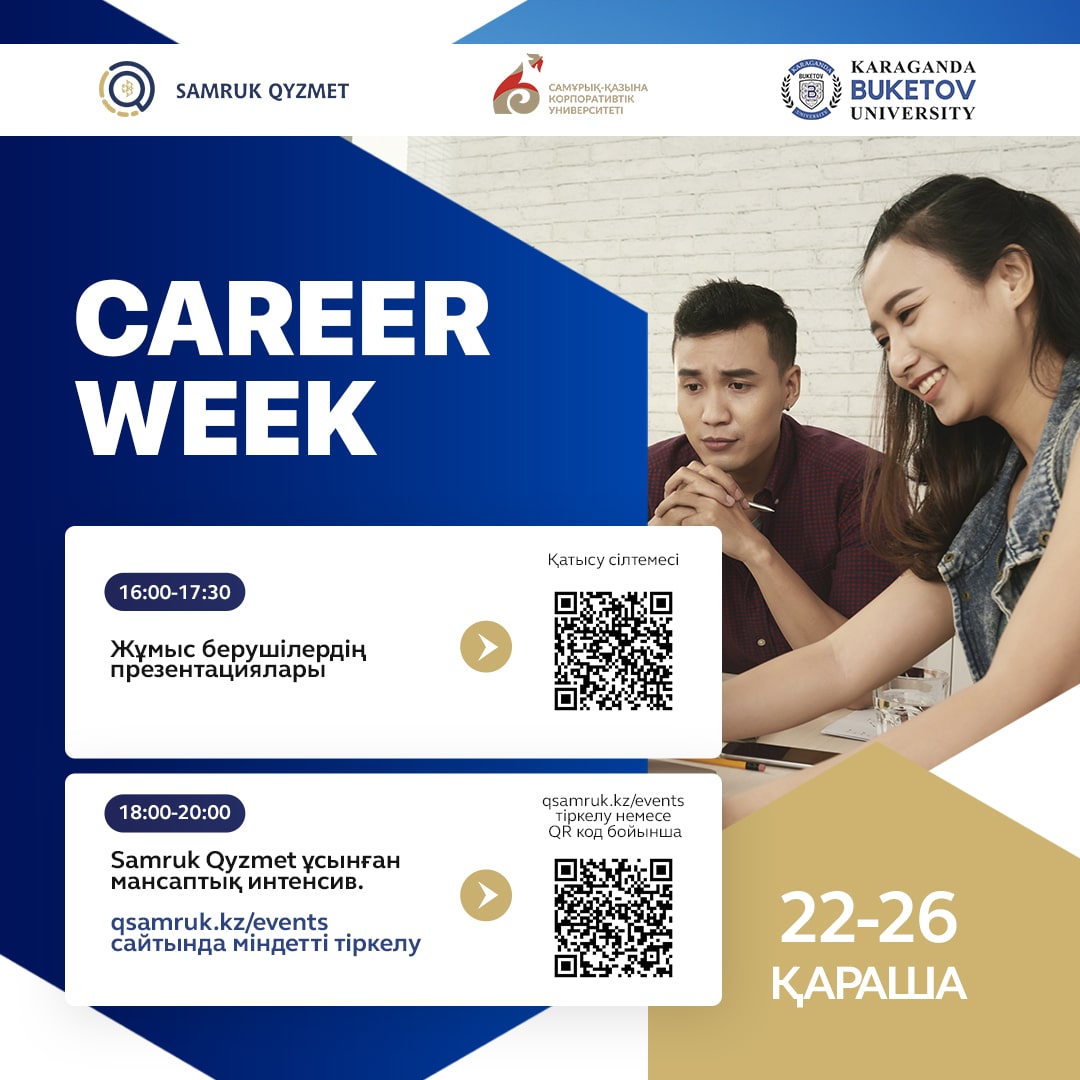 Мансап бөлімі сені Career Week-ке Samruk Qyzmet интесивімен бірге ұйымдастырылған іс-шараға шақырады, сен ала алатын мүмкіндіктер: