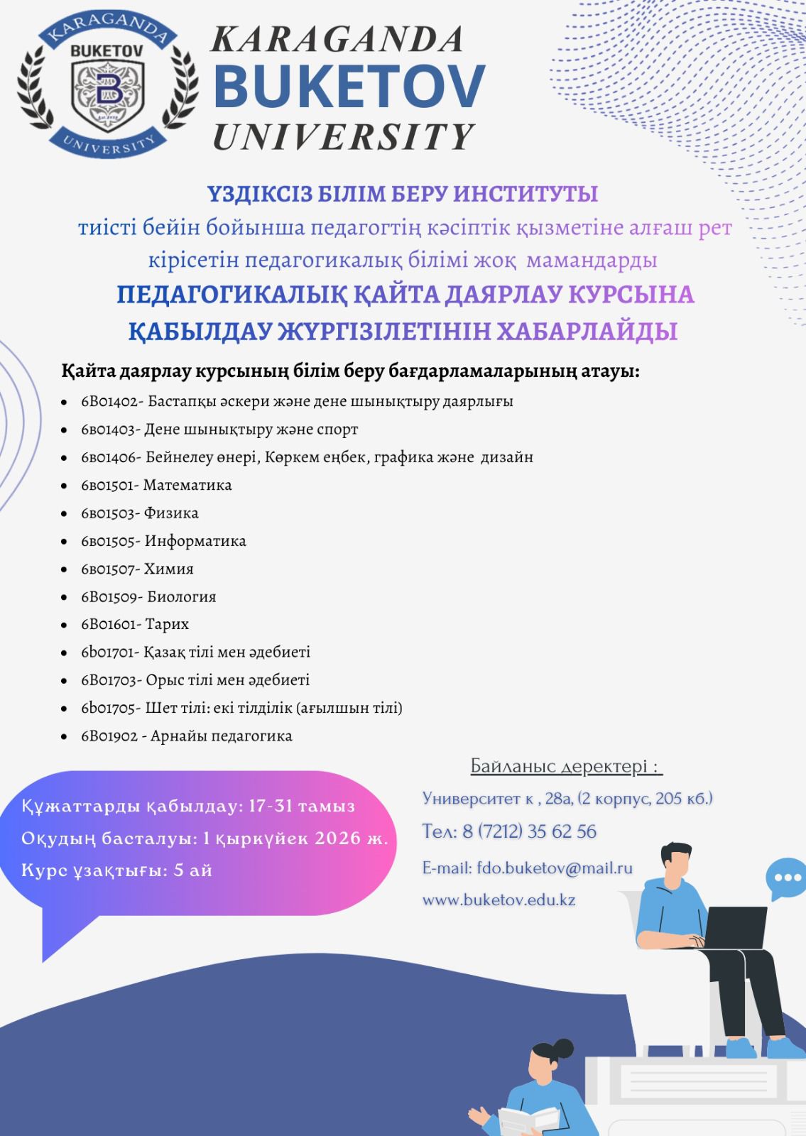 Үздіксіз білім беру институты тиісті бейін бойынша педагогтің кәсіби қызметіне алғаш рет кірісетін, педагогикалық білімі жоқ, кәсіптік білімі бар тұлғалар үшін педагогикалық қайта даярлау курстарына қабылдауды жариялайды.