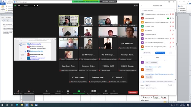 9 февраля 2022 г. Управлением маркетинга и рекрутинга проведена онлайн-встреча с заместителями директоров по воспитательной работе, ответственными за профориентационную работу общеобразовательных школ Осакаровского района. На встрече приняли участие школы №№ 1, 2, 7, 10, 11, 12, 13, 15, 16, 17, 21, 23, 25, 26, 28, 30, 31, 32, 33, 34. Охват аудитории составил 26 человек. По итогам встречи была достигнута договоренность о проведении онлайн встречи 16 февраля 2022 г. с выпускниками школ и их родителями.