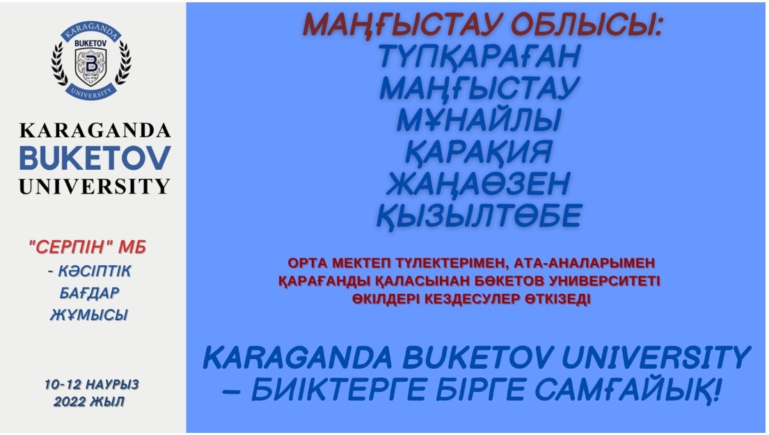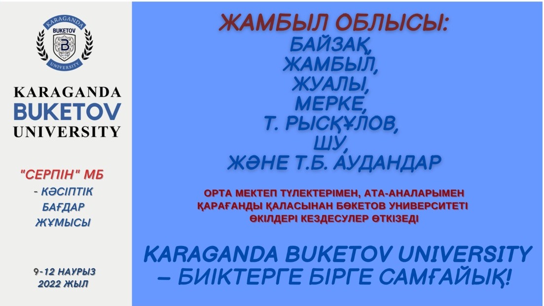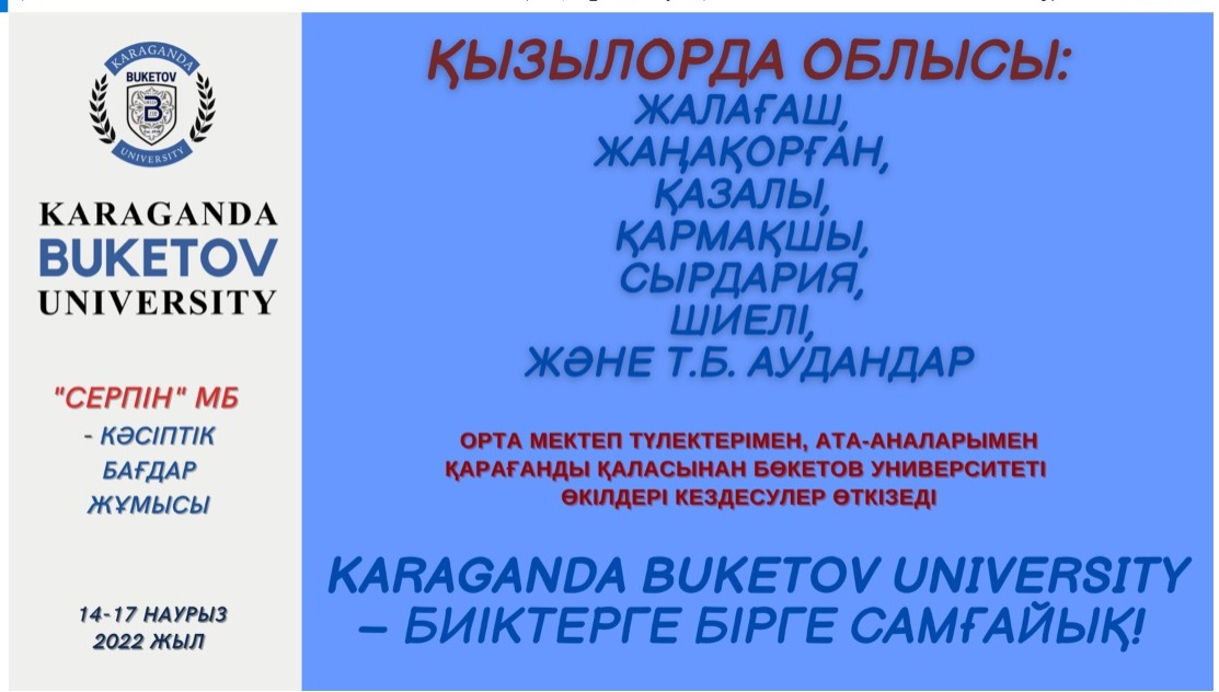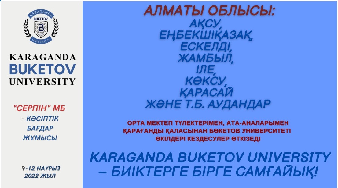 В рамках государственной программы «Серпін» официальные представители Карагандинского университета Букетова посетят районные центры и поселки Алматинской, Жамбылской, Кызылординской, Туркестанской, Мангистауской областей для проведения профориентационной работы среди выпускников школ. Ждите команду квалифицированных специалистов #buketovuniversity в вашем регионе с 9 по 17 марта 2022 года. Это отличная возможность получить ответы на актуальные вопросы! Karaganda Buketov University – стремимся вместе к вершинам успеха!